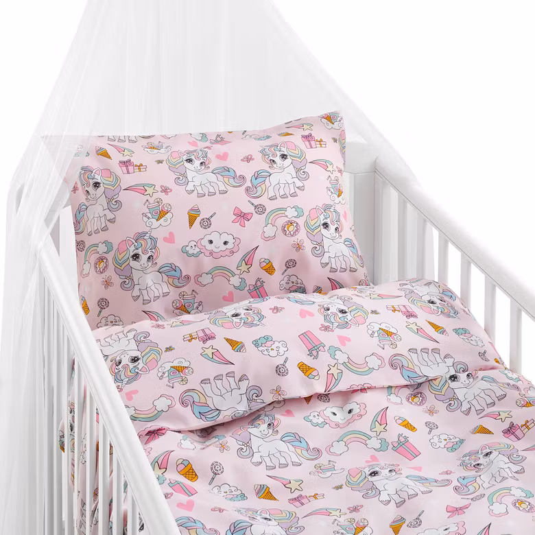 Mot den rosa botten dansar enhörningar, regnbågar, moln, glassar och presenter – en design som lockar till skratt och lek även i drömmarna.