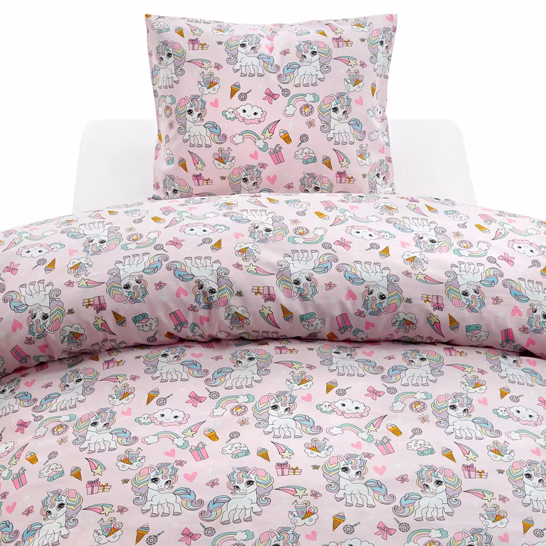 Med Enhörning Rosa bäddset från Borganäs of Sweden får du ett mjukt, färgglatt och fantasifullt sängset som gör att läggdags blir något barnet ser fram emot. Låt de magiska enhörningarna ta med barnet på drömmarnas mest glittrande äventyr – varje natt!