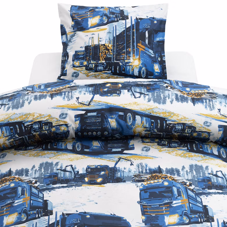 Med Lastbilar Marinblå barnbäddset från Borganäs of Sweden får du ett mjukt, hållbart och fantasifullt sängset som gör att barnen ser fram emot läggdags. Låt dem drömma om spännande lastbilskörningar och äventyr på vägarna – varje natt!