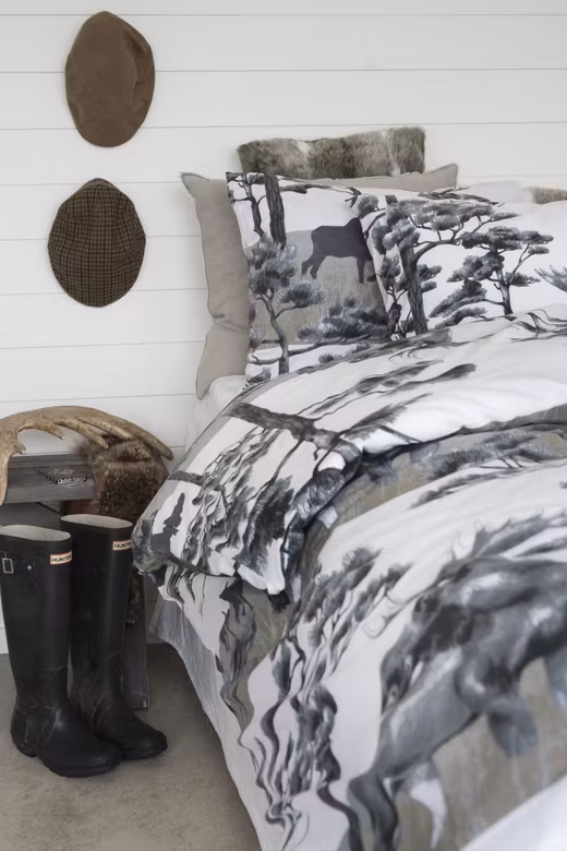 Det diskreta älgmotivet ger sängkläderna ett naturnära och harmoniskt uttryck som passar perfekt i både moderna och klassiska hem. De mjuka grå tonerna skapar en lugn bas som är enkel att kombinera med andra färger och textilier i sovrummet. Bäddsetet blir ett dekorativt inslag som samtidigt skapar ett avslappnande helhetsintryck.