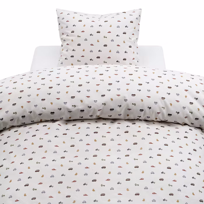 Bäddset John Beige – Lekfullt bäddset med fordon från Borganäs of Sweden.