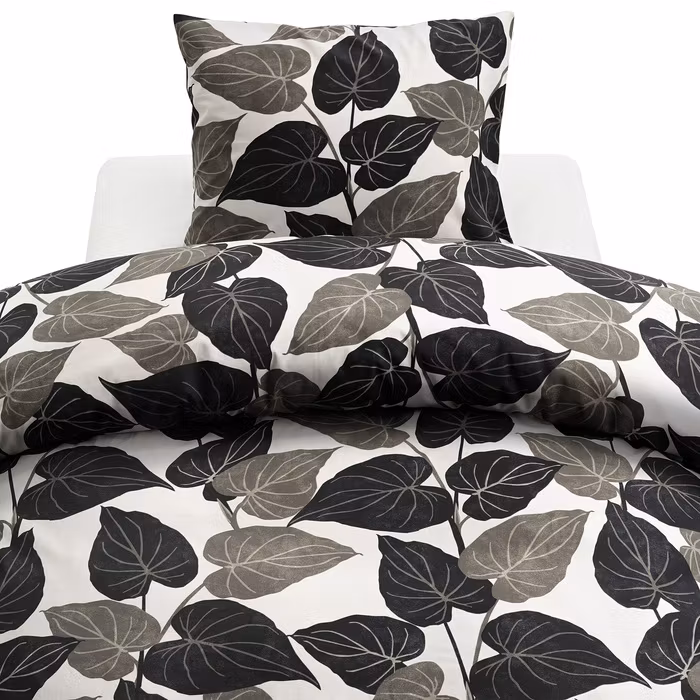 Detta vackra bäddset har ett naturinspirerat mönster av stora, slingrande blad i varma bruna toner, som skapar en känsla av att befinna sig i skogens stilla harmoni.