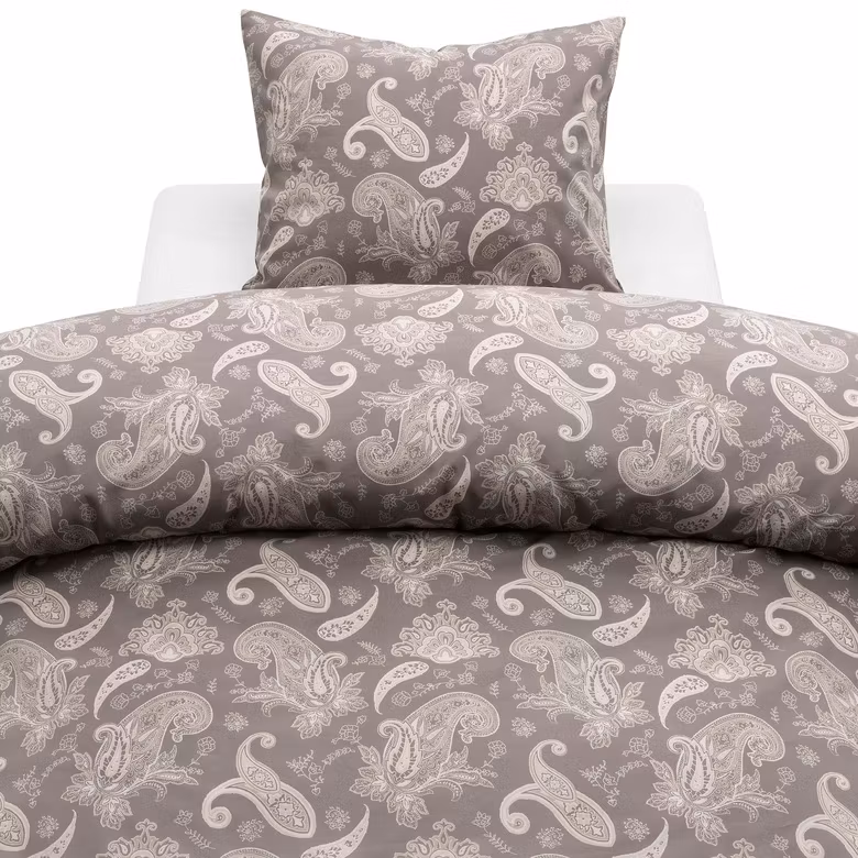 Detta vackra påslakanset utmärks av sitt romantiska paisleymönster i ljusbeige detaljer på en mörkt sandfärgad botten, vilket skapar en sofistikerad och varm känsla i rummet.