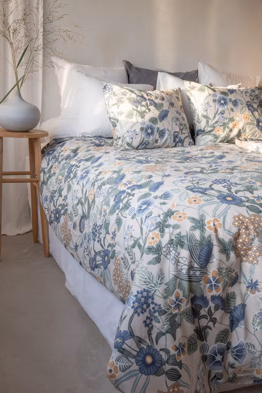 Blombacken Blå kännetecknas av sitt romantiska och somriga blommönster som skapar en inbjudande och livfull atmosfär i sovrummet. Färgkombinationen av blått, gult och grönt ger energi och glädje samtidigt som den beige bottenfärgen håller helhetsintrycket lugnt och harmoniskt.