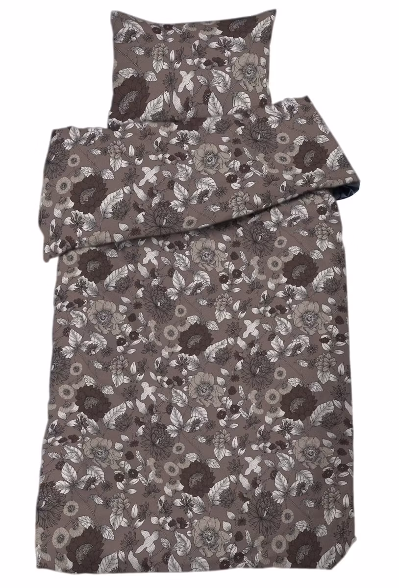 Dahlia har ett romantiskt och naturnära blommönster skapat av svensk designer. Färgkombinationen ger både djup och mjukhet, vilket gör bäddsetet lätt att matcha med neutrala toner och naturmaterial i sovrummet.