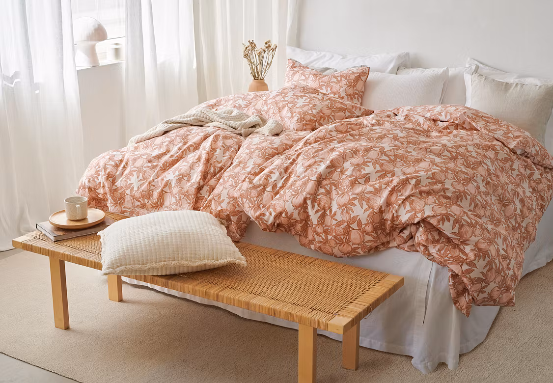 Pomegranate Peach kännetecknas av sitt lekfulla och grafiska mönster som tillför värme och personlighet till sovrummet. De aprikosfärgade granatäpplena skapar ett mjukt färgspel som ger rummet en ombonad och mysig atmosfär, samtidigt som den vita bottenfärgen håller helhetsintrycket ljust och fräscht.