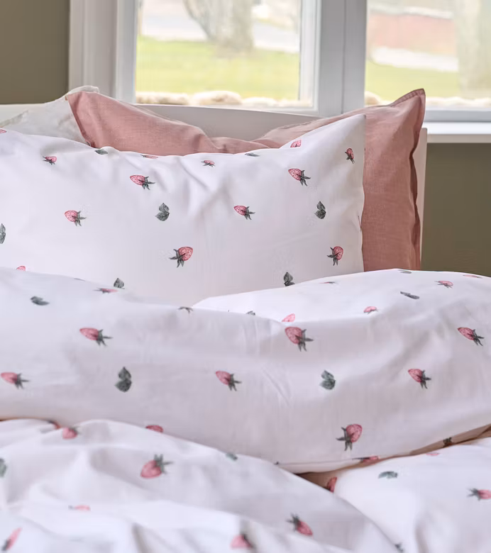 Jordgubbsdröm Röd kännetecknas av sin lekfulla men stilrena design. De små jordgubbarna ger ett livfullt uttryck samtidigt som den ljusa bottenfärgen gör bäddsetet lätt att kombinera med andra textilier och färger i sovrummet.